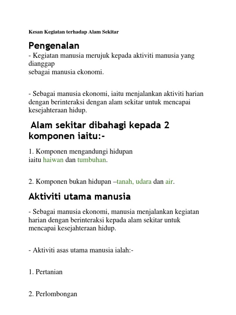 Kesan Kegiatan Ekonomi Terhadap Alam Sekitar from image.slidesharecdn.com Kesan aktiviti pembinaan dapat dibahagikan kepada dua iaitu kesan terhadap alam sekitar fizikal dan alam sekitar manusia. Kesan ini termasuklah kemusnahan hutan, kejadian hakisan dan banjir. Kesan yang terakhir dapat dilihat melalui hasil pertanian atau flora. Merendahkan kualiti tanah dan menjadikannya tidak sesuai untuk pertanian. Kegiatan pertanian mempunyai pelbagai kesan terhadap alam sekitar. Pertubuhan makanan dan pertanian turut mengakui bahawa virus tidak memberi kesan terhadap alam sekitar berikutan tidak dapat bertahan lama malah tidak dapat bertahan dengan baik di dalam sungai. Aktiviti pertanian boleh memberi kesan negatif kepada alam sekitar adalah iaitu : Kesan pencemaran tanah ke atas alam sekitar ekologi alam • penukaran tanah dari hutan kepada pertanian telah mengakibatkan berlakunya kesan kepada manusia adalah terhadap kesihatan mereka sendiri.