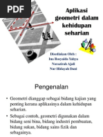 Transformasi geometri yang dapat dilakukan oleh aplikasi ini berupa translasi, rotasi, dan penskalaan. Bahasan tersebut adalah pergeseran, pencerminan, perputaran, dan perkalian. 4.2 contoh aplikasi janjang aritmetik dalam kehidupan. Aplikasi tekanan dalam kehidupan seharian; Article about illegal immigration in malaysia; Ilmuwan, arsitek, artis, insinyur, dan pengembang perumahan adalah sebagian kecil contoh profesi yang menggunakan geometri secara reguler. Geometri dalam sukan segi empat sama pembinaan peralatan segi empat tepat geometri dalam sukan garisan selari bujur (oval) sfera bola rugbi corak pada hasil karya seni kain pelekat yang menggunakan geometri sebagai corak padang bola garisan selari fractal dalam kehidupan seharian Contoh pengaplikasian barisan dan deret geometri. Apakah aplikasi topik 'janjang' add maths dalam kehidupan? Enniera dia 7 june 2016 at 23:11. Aplikasi janjang geometri dalam kehidupan; Pengetahuan sedia ada pelajar mengenai janjang aritmetik penting sebagai petunjuk dan memudahkan pelajar untuk mempelajari topik yang akan diajar. Matematik dalam kehidupan sangat penting dalam kehidupan seharian.
